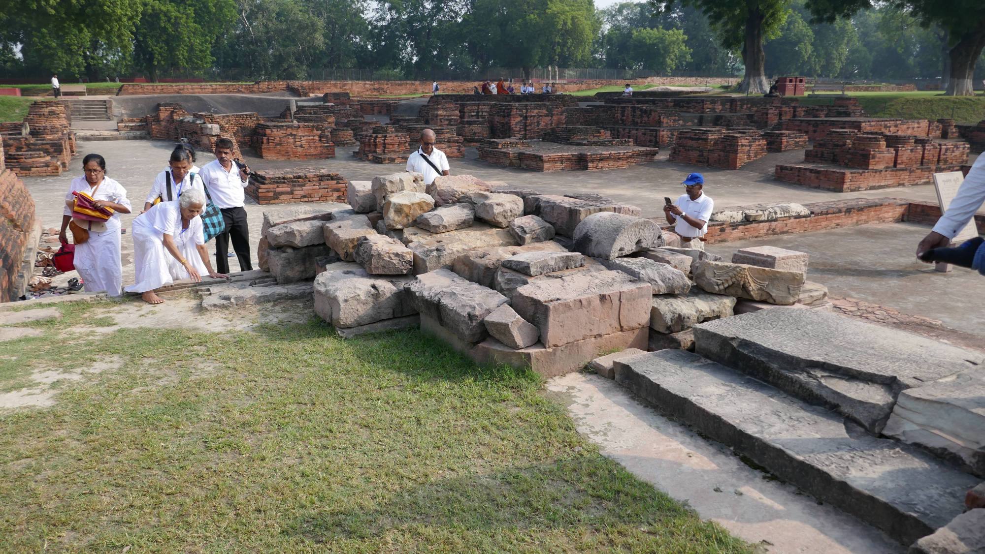 🌸 අප විසින් වන්දනා කළ විශාලා මහනුවර පූජනීය ස්ථානයක දී, මල්ල රජදරුවන්ට ලැබුණු භාග්යවතුන් වහන්සේගේ පරිනිර්වාණාන්තර ද්රෝණයක් ධාතූන් වහන්සේලා නිදන් කොට සෑදූ චෛත්යයක පාදම අද දක්වාත් පවතී. අපි එයද වන්දනා කළෙමු. බෞද්ධ ග්රන්ථවලට අනුව, බුදුන් වහන්සේගේ මහා පරිනිර්වාණයෙන්ම පසු, උන්වහන්සේගේ ධාතූන් වහන්සේලා කුෂිනගර් සහ පාවාහි මල්ල රජවරුන් ඇතුළු දහසය මහාජනපදවල පාලක කුමාරවරුන් අට දෙනෙකු අතර බෙදා දෙන ලදී. සෑම කෙනෙකුම ධාතූන්ගෙන් තම කොටස තැන්පත් කිරීම සඳහා තම තමන්ගේ අගනුවරෙහි ස්ථූපයක් ඉදි කළහ.
