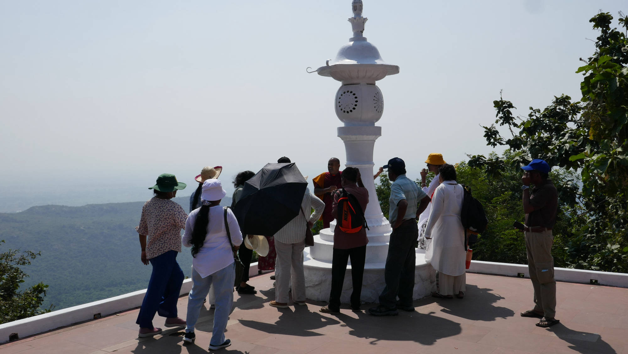 අපට ලැබුණු විශිෂ්ට අත්දැකීමක් වන්නේ රජගහනුවර කේබල් කාර් මඟින් ගිජ්ඣකූට පර්වතයේ සිට ජපන් සාම චෛත්යය ආසන්නයට ගමන් කිරීමයි. මෙහිදී අපි අතිශය සන්සුන් හා පුණ්යමය පරිසරයක් මැද පිහිටි සාම චෛත්යය වන්දනා කරමින් පූජා කිරීමට හැකි විය. විශ්ව ශාන්ති ස්ථූපය ලෙසද හැඳින්වෙන මෙය, ඉන්දියාවේ රාජ්ගිර් හි රත්නගිරි කන්ද මුදුනේ (මීටර් 400) පිහිටා ඇති සුදු කිරිගරුඬ ස්ථූපයකි. සාමය සහ අවිහිංසාව ප්රවර්ධනය කිරීම සඳහා ජපන් ජාතිකයන් විසින් ඉදිකරන ලද්දකි. එහි උපත, බුද්ධත්වය, දේශනා කිරීම සහ මරණය යන උන්වහන්සේගේ ජීවන අවධීන් නියෝජනය කරන බුදුන්ගේ රන් පිළිම හතරක් ඇත.🙏