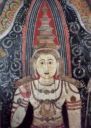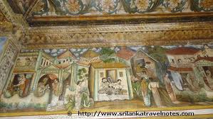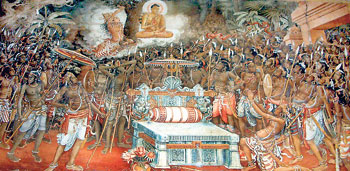 A painting at Kelaniya temple that depicts one of the instances that Lord Buddha is supposed to have visited Lanka to settle a dispuite between two factions
